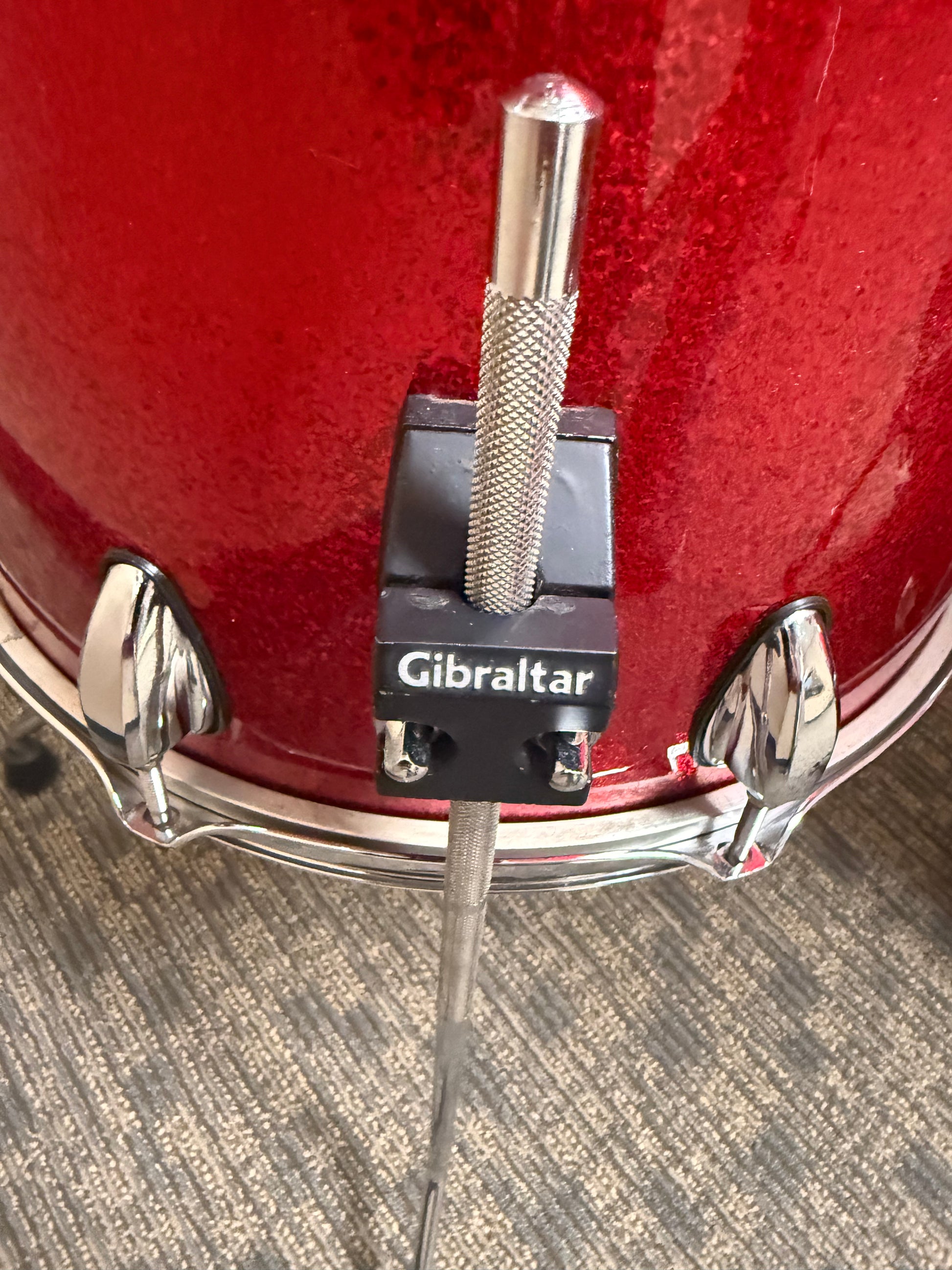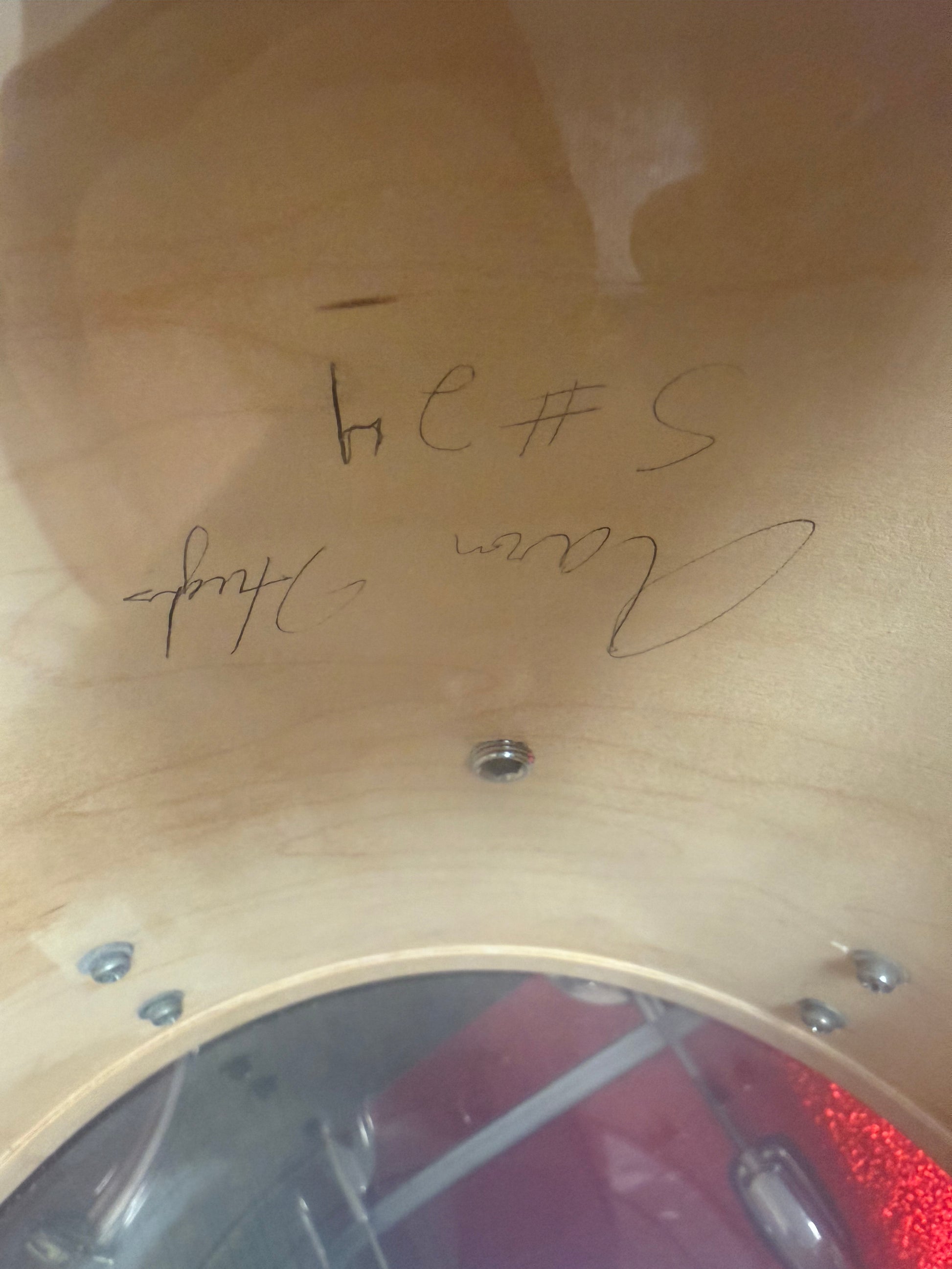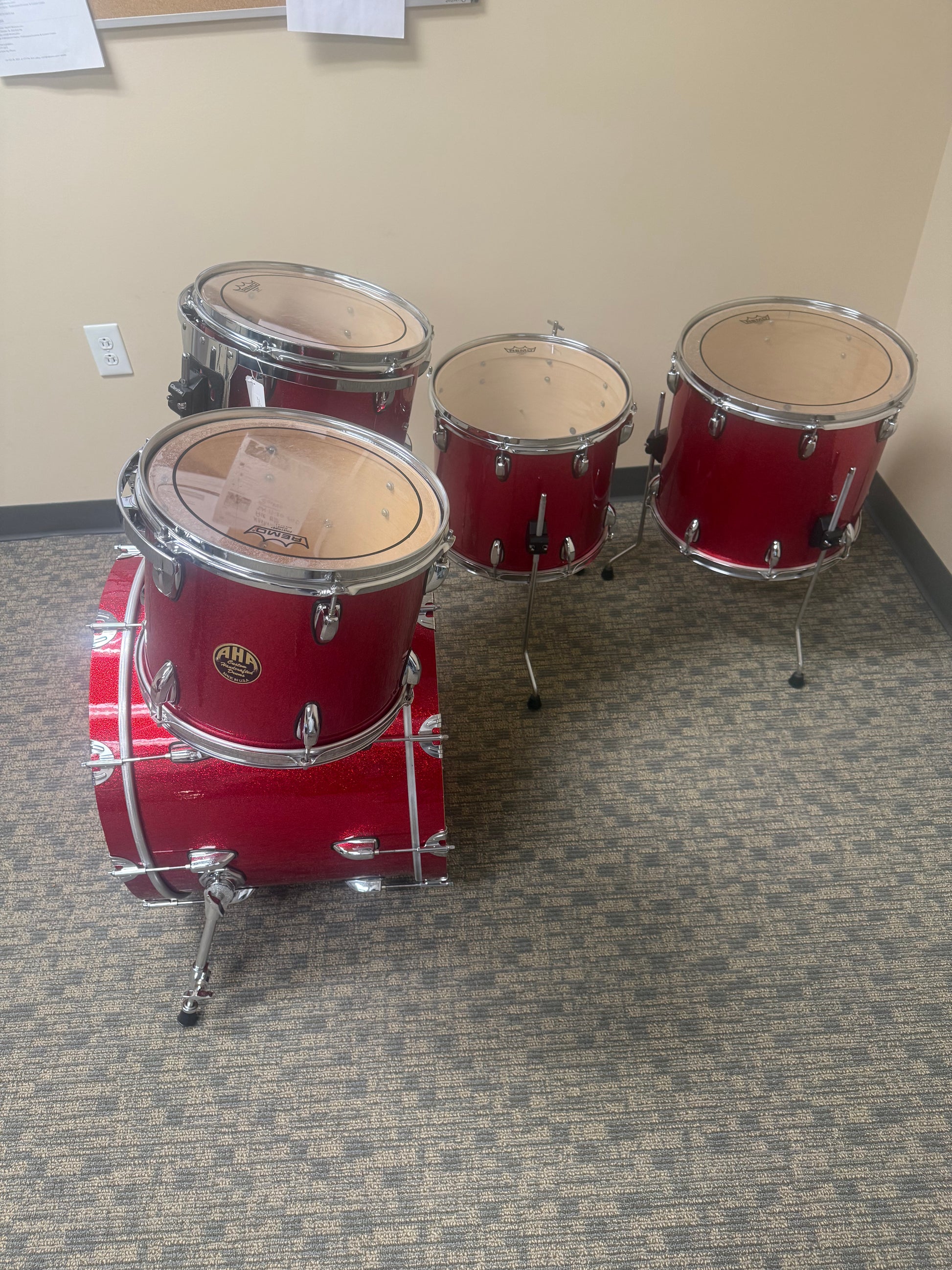 AHA Custom Red Sparkle Wrap Shell Pack, 3Ply Maple Re-ring Keller Shells. 12"x10" and 13"x10" Rack Tom,14"x12" and 16"x14" Floor Tom with a 22"x16" Bass Drum. AHA=Aron Hughes Association, Aron Hughes was a custom drum builder out of Gainesville Ga. Made in 2000.