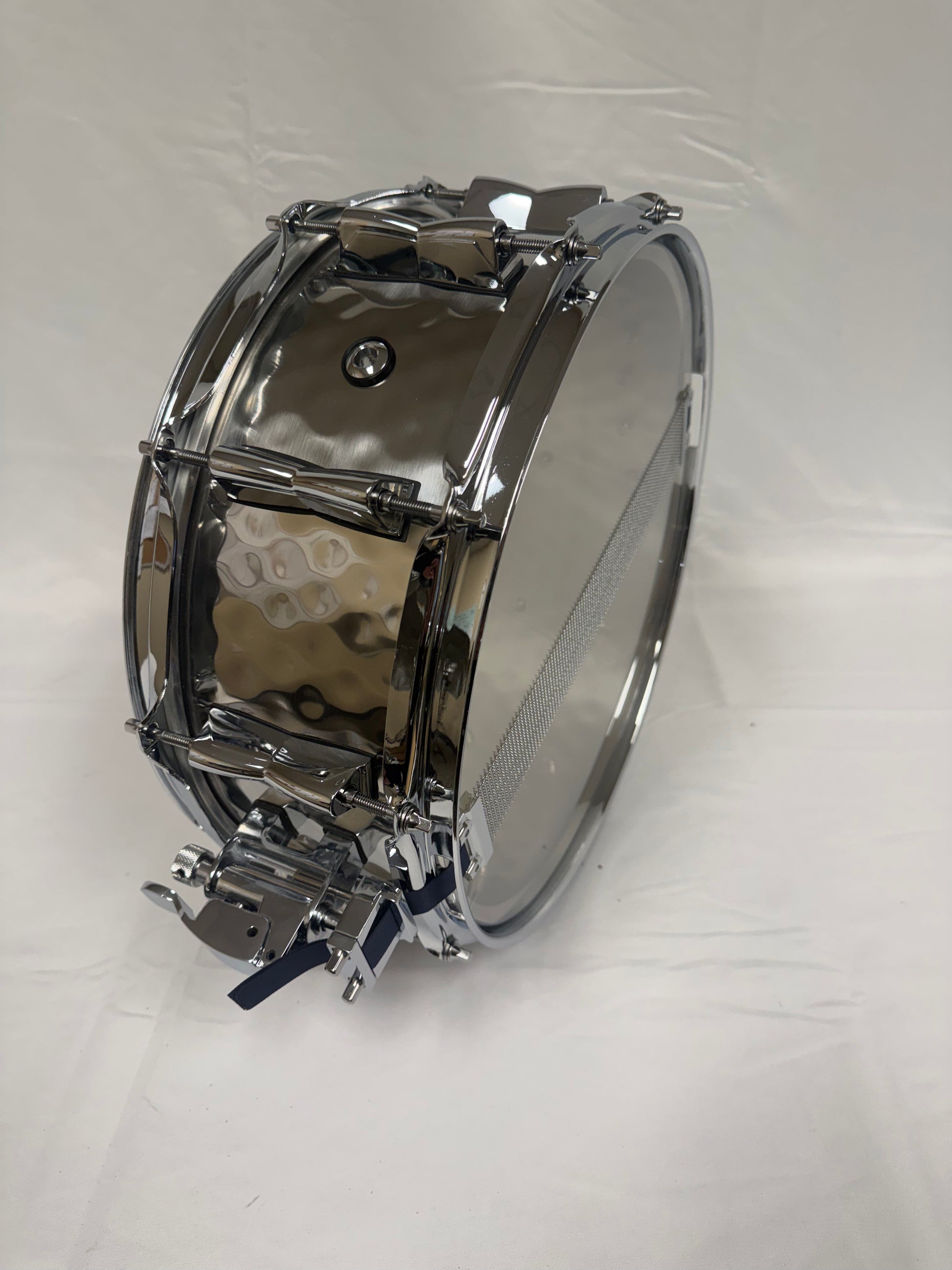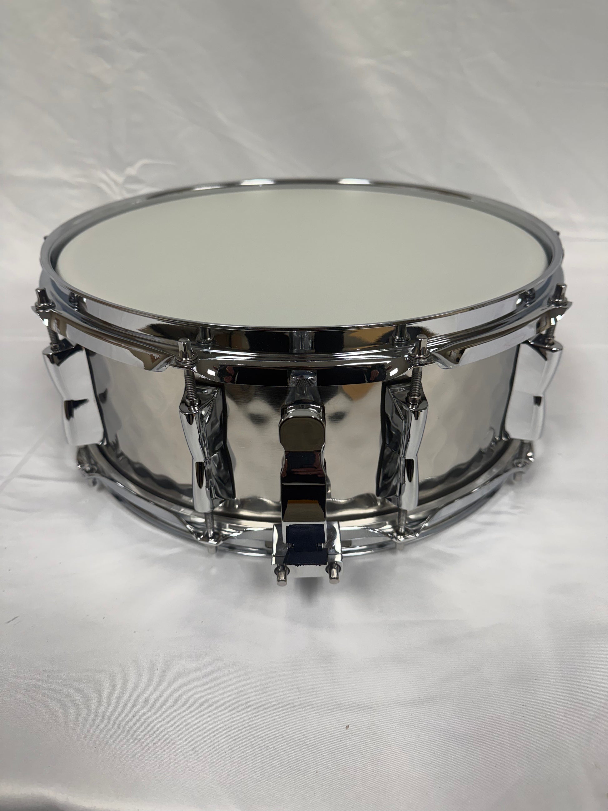 Brand New 14"x5.5" Hand Hammered Stainless Steel Snare Drum. 1mm Wall Thickness.2.3 triple flange hoops. Swivel Lock Throw Off.