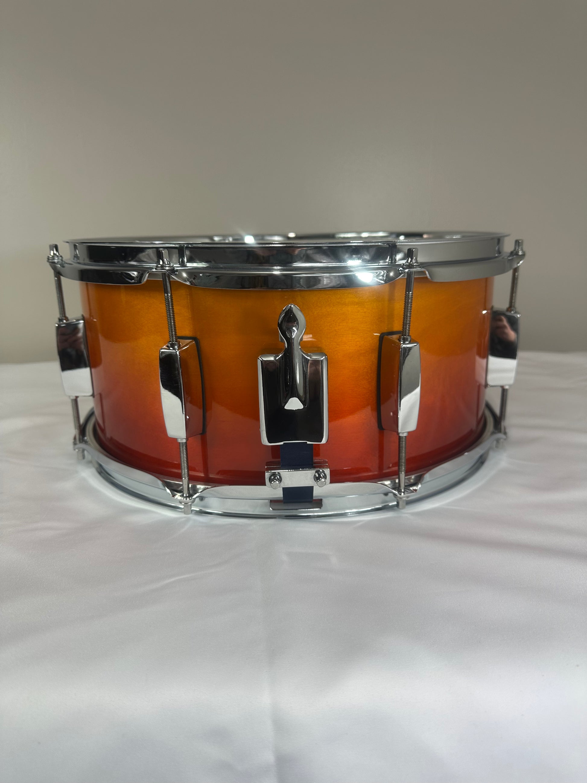 14"x6.5" Orange Burst Birch Snare. 7.2mm Thick Shell. Triple Flange Hoops Chrome Hardware. Easy Lock Throw Off.