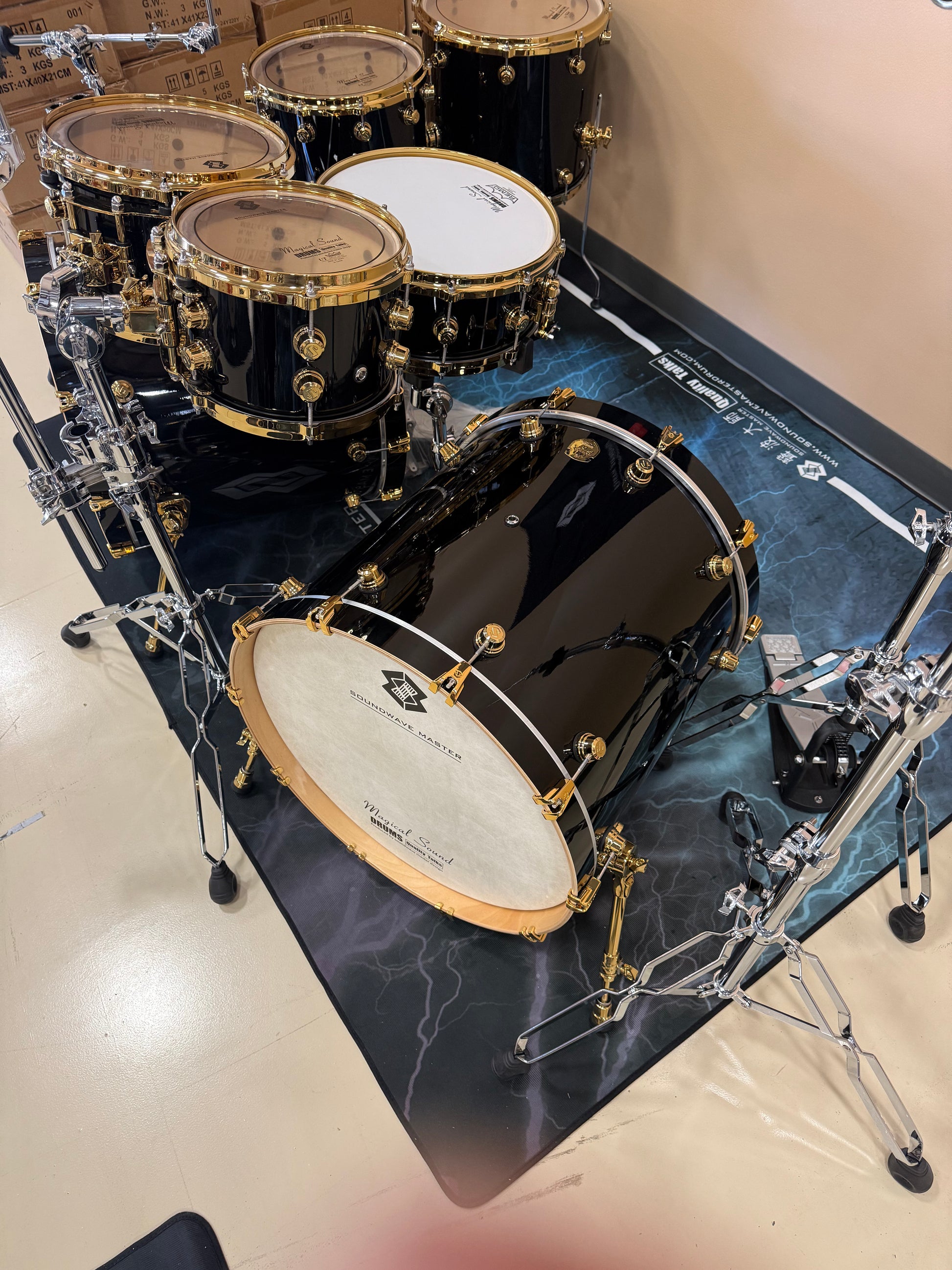 Designed with meticulous precision and expert craftsmanship, the Soundwave Masters series introduces the Glory Sound edition in Devil Black, providing a truly top-tier and customizable drumming experience. Featuring high-quality shells made of 2 Layers of Birch,2 Layers of North American maple,2 Layers of black walnut and Black walnut re-rings. This drum kit includes a (2) 22"x20" Bass Drum, 10"x7" and 12"x8" Rack Toms, 14"x14" and 14"x16" Floor Toms, and a 14"x6.5" Snare Drum. Complete with three Boom Stands, a double chain drive Hi-hat stand, and a double chain drive bass pedal, this kit is the epitome of world-class quality.
